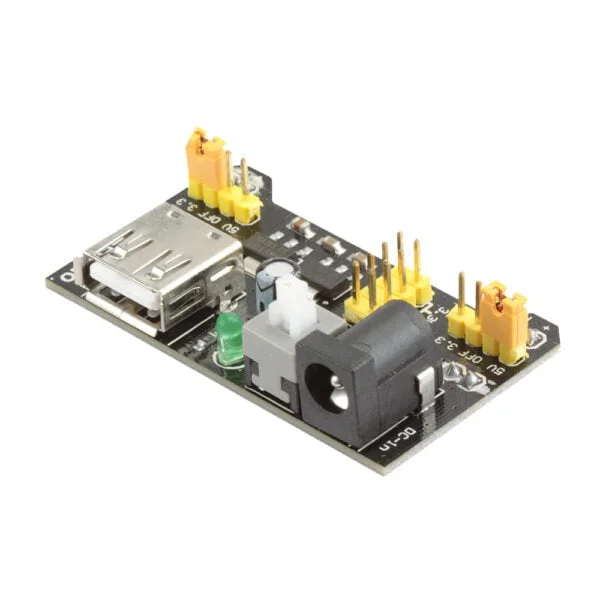 Esta placa é perfeita para alimentar as trilhas de uma protoboard. Basta alimentar a placa por um cabo USB ou fonte externa para ter a alimentação regulada em 5V ou 3,3V nas trilhas externas da protoboard. Jumpers na placa ajudam a escolher a tensão em cada lado das trilhas (podendo inclusive ter a alimentação desligada).